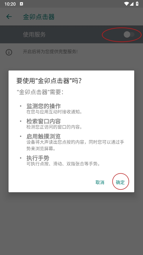 6、进入无障碍服务,开启使用服务开关即可,退出重启软件。