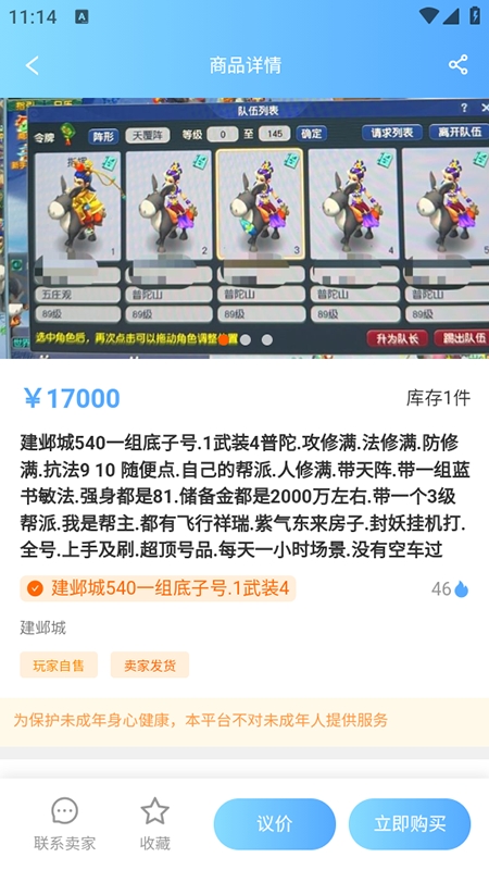 点击目标账号进入详情页,查看角色属性、装备、宝宝等信息,确认符合需求后,可点击“联系卖家”议价,或直接“收藏”对比其他账号;