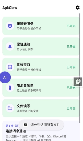 1、打开ApkClaw后首先将所有的权限打开,以便它能够正常运行工作