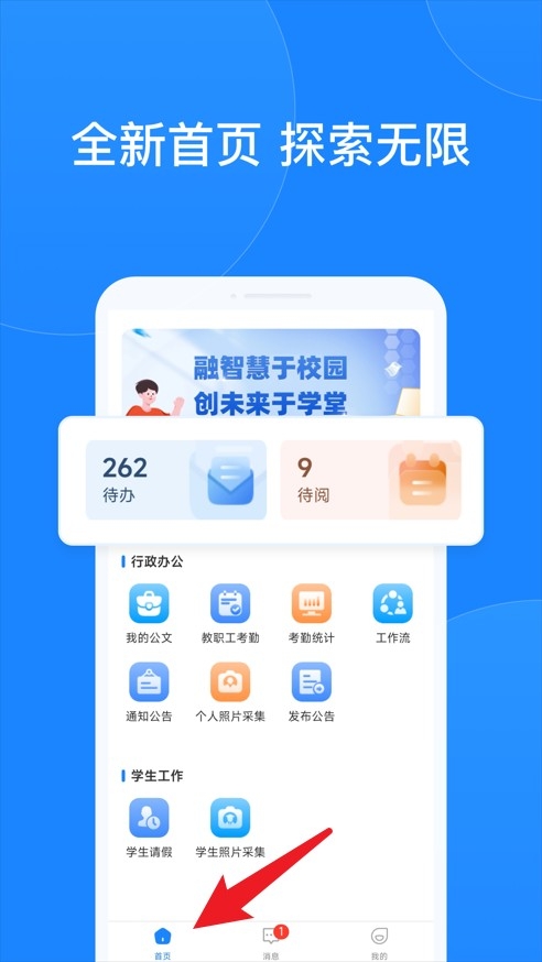 3、进入首页,可查看待办事项、公告通知等模块,快速掌握校园动态。