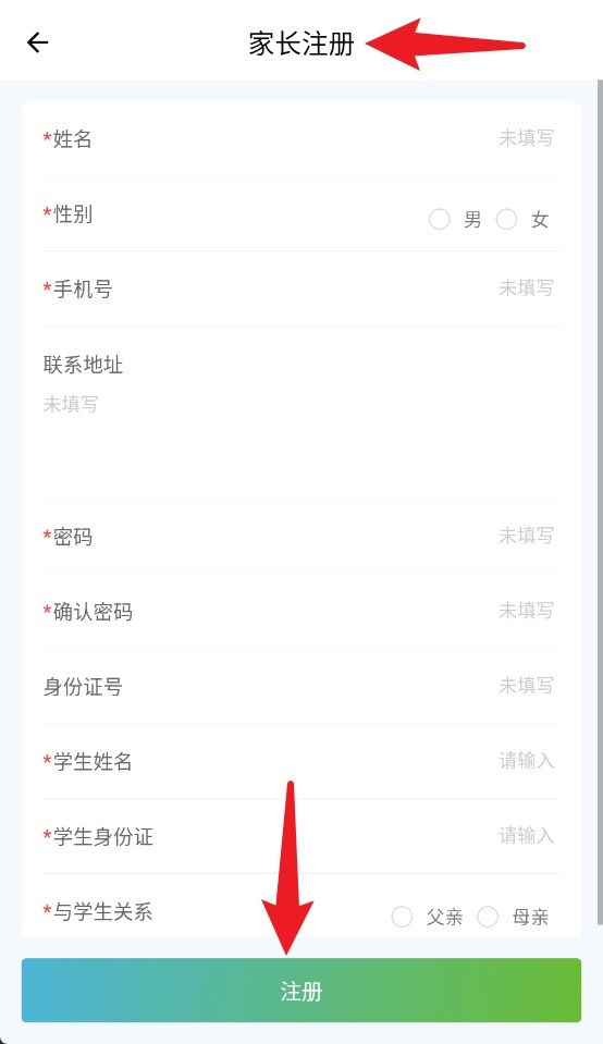 2、如您是家长,首次使用请选择家长注册,填写姓名、性别、手机号等信息后提交完成注册。
