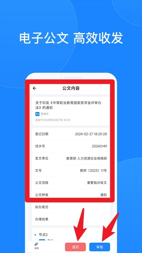 5、查看公文详情内容,可根据需要执行退回或审批操作,高效完成任务。