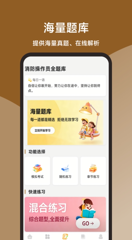 消防操作员全题库是一款汇集初、中、高级消防题库的刷题学习软件,这里有非常全面的题库等你来刷题,提供丰富的线上题库模拟,题库中的试题全真模拟真实的考试,可通过该软件实现同步学习。