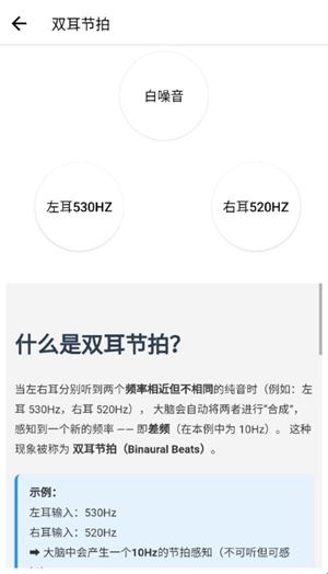 2.提供各种频率的自然声音,如流水声和噪声,同时支持单频率、多频率和双耳节拍;