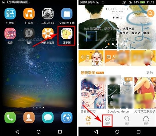 点击打开【菠萝饭】,点击下方的【圈子】;(如下图)