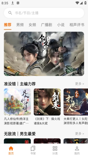 1、软件首页为大家推荐了众多热门广播剧资源,用户可以根据频道或者类型筛选。