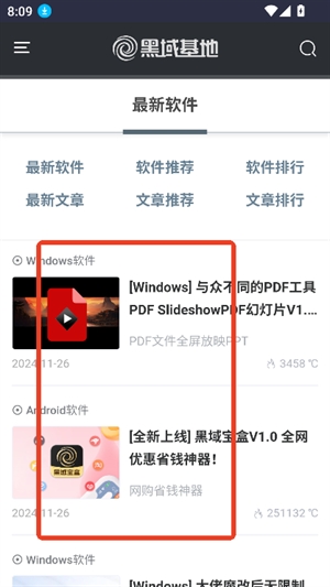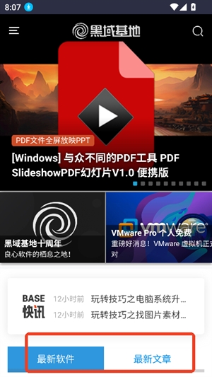 1、在本站下载安装黑域基地软件库app2、打开进入软件,首页中有着最新软件和最新文章两个板块