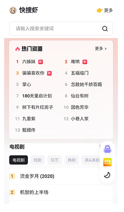快搜虾是一款非常好用的资源库软件,为用户提供更多的方式的便利的,可以设置自己的隐私服务,而且观看也是没有任何的广告的,用户可以放心的来使用,需要的伙伴们快来下载试试吧。